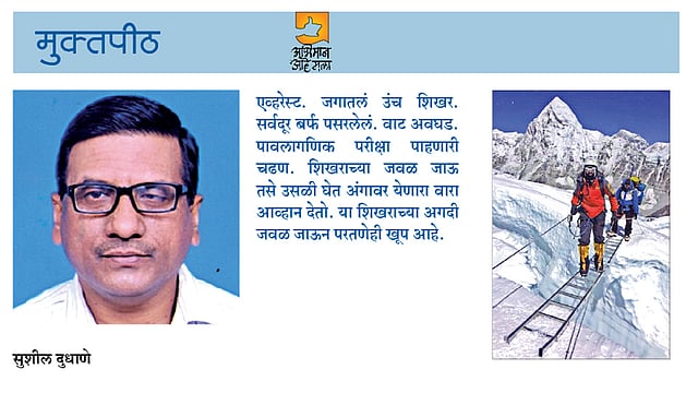 एव्हरेस्ट. जगातलं उंच शिखर. सर्वदूर बर्फ पसरलेलं. वाट अवघड. पावलागणिक परीक्षा पाहणारी चढण. शिखराच्या जवळ जाऊ तसे उसळी घेत अंगावर येणारा वारा आव्हान देतो. या शिखराच्या अगदी जवळ जाऊन परतणेही खूप आहे.