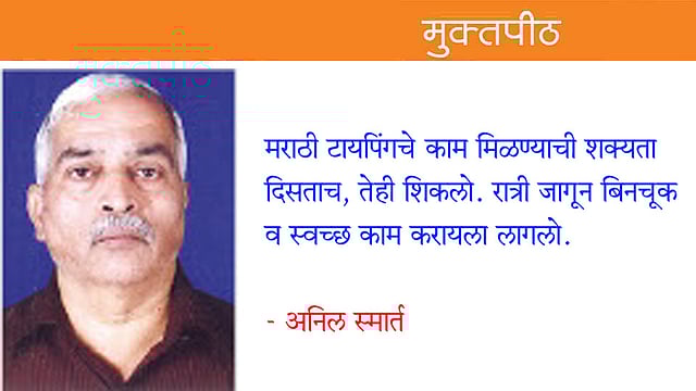 एकदा भवानी पेठेतील डावरे वकिलांनी मला मराठी टायपिंगविषयी विचारले. खरे तर त्या वेळी मला मराठी टंकलेखन अजिबात येत नव्हते, पण एकच क्षण विचार करून त्यांना मी लगेच ‘हो.. येते की’ असे उत्तर दिले. पुन्हा वाणींकडे गेलो. त्यांनी त्यांच्या गोदामामधून एक मशिन काढून दिले. मी ते मशिन घरी आणून चांगले साफसूफ करून, त्याला नमस्कार केला. एक कागद मशिनवर चढवून सगळी अक्षरे उठवून बघितली. मराठीत काना, मात्रा, वेलांटी, उकार अशी सगळी छप्पन अक्षरे. इंग्रजीत फक्त सव्वीस. मशिनच्या काही ‘कीज’ अस्पष्ट होत्या, त्याला ‘स्टिकर्स’ लावले. दुसऱ्या दिवशी ऑफिसमधून आल्यावर आवरून मराठी टायपिंगचा ‘श्री गणेशा’ केला. दोन्ही हातांच्या एका-एका बोटाने ते मराठी टायपिंगचे सात पानाचे काम करायला मला बरोबर सात तास लागले. काम पूर्ण झालेले बघून मला खूपच आनंद झाला. डावरे वकील म्हणाले, ‘‘अहो, तुमचे मराठी टायपिंगही छान, बिनचूक आहे.’’