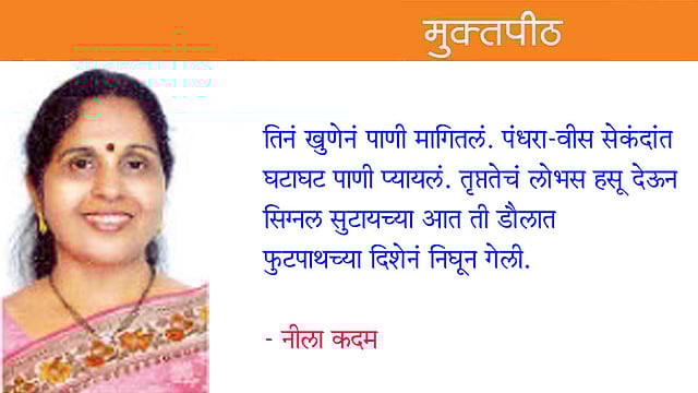 तिनं खुणेनं पाणी मागितलं. पंधरा-वीस सेकंदांत घटाघट पाणी प्यायलं. तृप्ततेचं लोभस हसू देऊन सिग्नल सुटायच्या आत ती डौलात फुटपाथच्या दिशेनं निघून गेली.