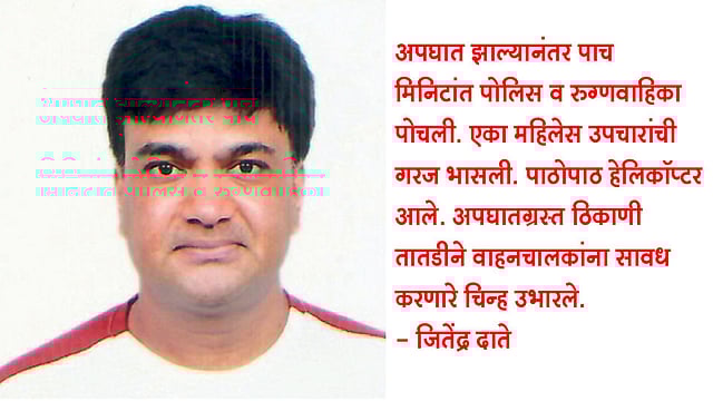 माझ्या मागून एक तरुण त्याच्या हातात साखळीने बांधलेले दोन कुत्रे धरून धावत पुढे निघून गेला. चढ चढून वर पोचल्यावर पुढे गेलेला तरुण रस्त्याकडेला बेशुद्ध अवस्थेत पडला होता. त्याच्यापासून दहा फुटांवर दोन्ही कुत्रे मृतावस्थेत पडले होते. एक उंच सडपातळ तरुण मोटार कडेला लावून उभा होता. गाडीवरील उडालेल्या रक्तावरून बहुदा त्याच्या हातूनच अपघात घडला असावा. अवघ्या चारच मिनिटांत तिथे रुग्णवाहिका आणि पोलिस पोचले. शेजारीच असलेल्या गृहप्रकल्पातून जाणाऱ्या पर्यायी मार्गावरून रहदारी सांभाळण्यात पोलिस गर्क झाले.