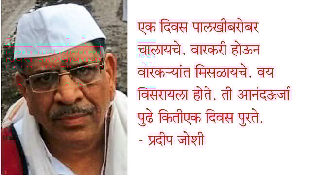 एक दिवस पालखीबरोबर चालायचे. वारकरी होऊन वारकऱ्यांत मिसळायचे. वय विसरायला होते. ती आनंदऊर्जा पुढे कितीएक दिवस पुरते.