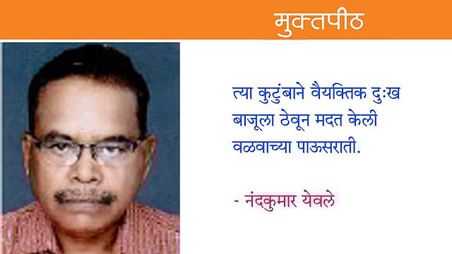 आम्ही पुरुषमंडळी बाहेर ओसरीवर गप्पा मारत बसलो होतो. घरातील कर्त्या पुरुषांच्या चेहऱ्यावर दुःखाची छटा दिसत होती. प्रत्येकाचे क्षौर केले होते. इतक्यात थोरला भाऊ चहा देत म्हणाला, ""आजच आमच्या वडिलांचा तेरावा झाला. देवाने आमचे दुःख हलके करण्यासाठी तुम्हाला आमच्याकडे पाठविले आहे.'' आम्ही आभार मानून निघालो, तोच ती मघाचीच वृद्ध स्त्री जेवून जाण्याचा आग्रह करू लागली. म्हणालो, "मावशी, आपलं दुःख दूर सारून तुम्ही आमच्यावर उपकार केलेत, आणखी कशाला तसदी?' ती म्हणाली, "बाबा, तुज्यावानी माजा धाकला लेक हाय. आडल्यानडल्याला मदत केली म्हंजे परमेश्वर आपल्याला कायबी कमी करत नाय बग.' आपले वैयक्तिक दुःख बाजूला सारून मदत करणारे ते कुटुंब दहा-बारा वर्षांनंतरही माझ्या स्मरणात आहे.