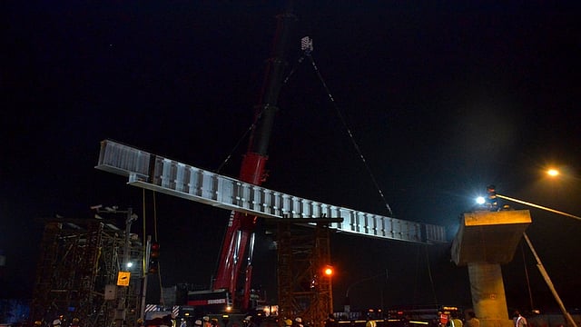 मुंबई : मुंबई महानगर प्रदेश विकास प्राधिकरणामार्फत (एमएमआरडीए) वांद्रे पूर्व कलानगर जंक्शनवर उभारण्यात येत असलेल्या उड्डाणपुलाचे बांधकाम अंतिम टप्प्यात पोचले आहे. शनिवारी (ता. 10) मध्यरात्री कलानगर उड्डाणपुलावर स्टील गर्डर उभारण्याच्या कामाला सुरुवात करण्यात आली. रविवारी (ता. 11) सकाळी ते पूर्ण करण्यात आले. कलानगर उड्डाणपुलावर तिसरा गर्डर बसविण्यात आला आहे. उड्डाणपुलाचे काम यंदाच्या 31 डिसेंबरपर्यंत पूर्ण करण्यात येणार आहे.
