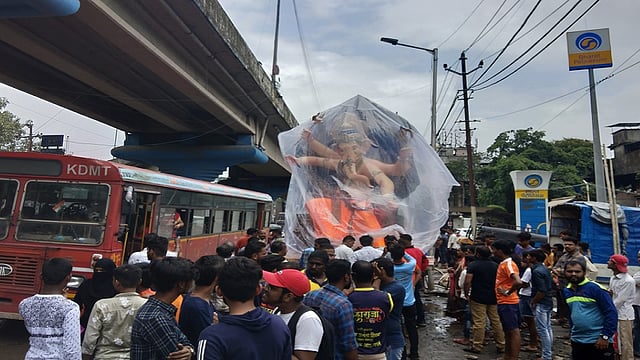 कल्याण रोड मार्गावर खराब रस्ता व उड्डाणपुलाचे काम सुरू आहे. शहरातील काप आळी येथील सार्वजनिक गणेशोत्सव मंडळाच्या मूर्तीची वाजत-गाडत मिरवणूक सुरू होती. मात्र, रस्त्यांवरील खड्ड्यांने बाप्पाच्या आगमनात मोठा अडथळा निर्माण झाला. परिणामी वाहतूक कोंडी झाली. अखेर वरिष्ठ पोलिस निरीक्षक ममता डिसोझा यांना याबाबतीत तक्रार जाताच त्यांनी घटनास्थळी धाव घेऊन मूर्तीचा मार्ग मोकळा केला.