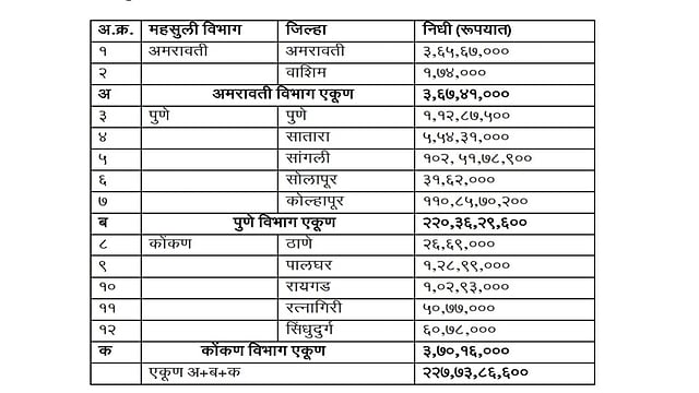यासंदर्भात राज्य सरकारकडून अमरावती, पुणे, कोकण या तीन विभागांसाठी मदत निधी वितरीत करण्यात येणार आहे. यामध्ये एकूण 227 कोटी 73 लाख 86 हजार 600 रुपयांचा निधी वितरीत केला जाणार आहे.