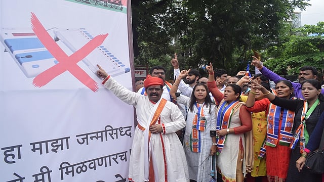 ठाणे : मतदानासाठी ईव्हीएम मशीन बंद करून पुन्हा एकदा मतपत्रिकेद्वारे निवडणुका घेण्याच्या मागणीसाठी ठाण्यातील सरकारी विश्रामगृहासमोर मनसेच्या वतीने आंदोलन करण्यात आले. गुरुवारी (ता. १) मनसे ठाणे शहराध्यक्ष रवींद्र मोरे यांच्या नेतृत्वाखाली केलेल्या या आंदोलनात मनसे कार्यकर्ते मोठ्या संख्येने सहभागी झाले होते.