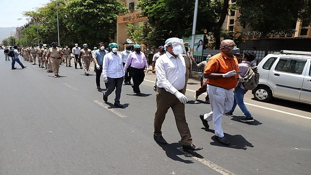 नवी मुंबई शहरात गेल्या मार्च ते मे या तीन महिन्यांच्या कालावधीत सुमारे दीड हजार कोरोनाबाधित रुग्ण सापडले आहेत. यातील 50 टक्के रुग्ण बरे होऊन घरी परतले आहेत. सध्या कोरोनाचे रुग्ण सापडण्याची टक्केवारी सुद्धा घसरलेली आहे. मात्र, रोज कोरोनाचे सरासरी 50 रुग्ण सापडतच असल्याने रुग्णांची संख्या हळूहळू का होईना पण वाढत राहिलेली आहे. महापालिका आणि पोलिस प्रशासनातर्फे अनेकदा प्रयत्न केल्यानंतरही नागरीकांचे घराबाहेर रस्त्यावर पडण्याचे प्रमाण घटलेले नाही. जीवनावश्यक वस्तू आणण्याच्या नावाखाली आजही रस्त्यावर भरवल्या जाणाऱ्या बाजारपेठा गजबजलेल्या असतात. कन्टेन्मेंट झोनमध्येही फारशी दक्षता घेतली जात नाही. कन्टेन्मेंट झोनमध्ये नागरिक रस्त्यावर फिरल्यास कोरोना वाहकाच्या साखळ्या निर्माण होऊन अधिक आजार फोफावण्याची शक्यता वर्तवण्यात येत आहे. त्यामुळे आज नवी मुंबई पोलिसांतर्फे कोपरखैरणे परिसरात रस्त्यावर लाँग मार्च काढण्यात आला होता. त्यामध्ये परिमंडळ एकचे पोलिस उपायुक्त पंकज डहाणे यांच्यासह अण्णासाहेब मिसाळ सहभागी झाले होते. पोलिसांनी रस्त्यावर संचलन करून बाहेर न फिरण्याचे नागरिकांना आवाहन केले.