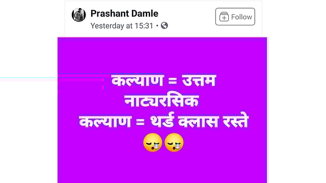 रविवारी संध्याकाळी कल्याणच्या आचार्य अत्रे रंगमंदिर प्रशांत दामले यांच्या नाटकाचा प्रयोग होता. या प्रयोगासाठी येताना शहरातील रस्त्यांच्या दुरवस्थेमुळे प्रशांत दामले त्रस्त झाले. त्यामुळेच त्यांनी कल्याणतील नाट्यरसिक उत्तम, मात्र रस्ते थर्ड क्लास अशी टीका केली.