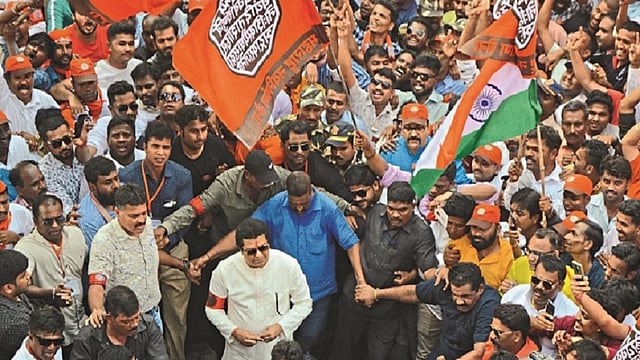महामोर्चासाठी राज ठाकरे जय्यत तयारीने घराबाहेर पडले. त्या वेळी त्यांनी पहिल्यांदाच आपल्या दंडावर राजमुद्रा असलेला बॅंड धारण केला. कृष्णकुंजवर आलेल्या कार्यकर्त्यांच्या दंडावरदेखील त्यांनी स्वत: राजमुद्रा असलेला बॅंड बांधला. यानंतर पत्नी शर्मिला, मुलगा अमित आणि सून मिताली ठाकरे यांच्यासह राज ठाकरे आपल्या 9 क्रमांकाच्या वाहनाने सिद्धिविनायक मंदिरात जाऊन श्रींचे दर्शन घेऊन सभास्थानाच्या दिशेने रवाना झाले.