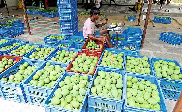 फोटो ओळी : बागेतील आंबा वजनाप्रमाणे पॅकिंग करून मुंबई, पुणे, ठाणे, गुजरात बाजारपेठेत पाठविला जातो.
