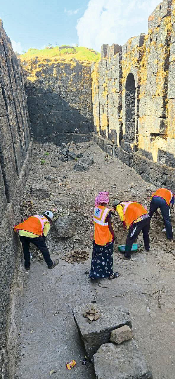 ३. माती हटवल्यानंतर कोठारामध्ये शिवकालीन फरसबंदीचे अवशेषही उघडकीस आले असून, या वास्तूंचे मूळ स्वरूप आणि वापर अधिक स्पष्ट होत आहे.