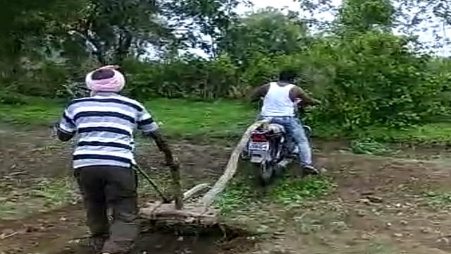 मजुरांच्या हातालाही काम मिळत आहे. परंतु, गेल्या तीन ते चार वर्षांपासून या परिसरात निसर्गाच्या प्रकोपामुळे, कधी अल्प पाऊस, कधी जास्तीचा पाऊस होण्याने, शेतकऱ्यांच्या हाताशी आलेली सुगी वाया जात असल्याने नाईलाजाने अनेक शेतकऱ्यांनी आपली बैलजोडी विकून यंत्राच्या साह्याने (ट्रॅक्टर) शेतीची पूर्वमशागत करीत आहेत. यामुळे प्रत्येक गावातील बैलजोड्यांचे प्रमाण कमी झाले आहे. याचा फटका गरीब अल्पभूधारक शेतकऱ्यांना बसला असून मृग नक्षत्राचा पाऊस अगदी वेळेवर पडल्याने इतर शेतकऱ्यांप्रमाणेच आपणही निघालेल्या कापसात डवरणी, वखरणी करावी यासाठी प्रयत्नशील असतानाही बैलजोडीअभावी त्यांना वखरणी साध्य होत नाही. कापसात जास्तीचे गवत होण्याने निंदणी, खुरपणीसाठी लागणारा खर्च परवडत नसल्याचे पाहून घोगरी येथील लक्ष्मण गुलेवाड व साईप्रसाद गुलेवाड या बाप-लेकांनी युक्ती लढवून चक्क मोटारसायकलला वखर बांधून हळूहळू प्रत्येक तासाने मोटार चालवून जवळपास तीन एकर शेतातील कापसाची वखरणी उरकून घेतली आहे.