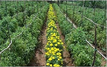 टोमॅटोवरील फळ पोखरणारी अळी आणि सुत्रकृमींच्या नियंत्रणासाठी टोमॅटो पिकाभोवती झेंडूची एक ओळ सापळा पिक म्हणून लावावी.