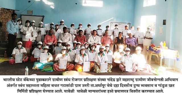 भारतीय स्टेट बँकेच्या पुढाकाराने ग्रामीण स्वंय रोजगार प्रशिक्षण संस्था नांदेड द्वारे महाराष्ट्र ग्रामीण जीवनोन्नती अभियान अंतर्गत स्वंय सहाय्यता महिला बचत गटासांठी ग्राम उमरी (ता.अर्धापूर) येथे प्रारंभ झालेल्या दहा दिवसीय दुग्ध व्यवसाय व गांडुळ खत निर्मिती प्रशिक्षणात ३५ महिलांनी सक्रीय सहभाग घेतला.