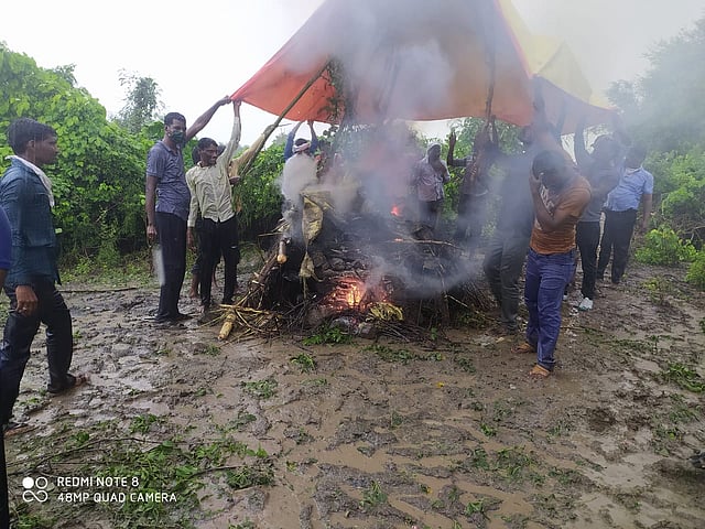 पावसात शारिरीक अंतर ठेवत मृतदेहावर अंत्यसंस्कार