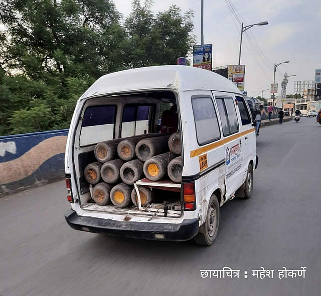 नांदेड : कोरोनाच्या पार्श्वभूमीवर जिल्ह्यासह संबंध देशभरात हाहाकार पसरला आहे. रुग्णवाहिका रुग्णांचा जीव वाचविण्यासाठी सतत रस्त्यावर असतात. रुग्णवाहिकेचे सायरन कानावर पडताच गंभीर रुग्णाला उपचार वेळेत मिळावेत म्हणून अन्य वाहने पाठीमागून येणाऱ्या रुग्णवाहिकेला रस्ता मोकळा करुन देतात. परंतु आता चक्क नांदेडमधून रुग्णांची तर वाहतुक होत आहेच. त्याशिवाय ऑक्सीजन सिलेंडर वाहतूक करणारी रुग्णवाहिका अनेकांचे लक्ष वेधत आहे. या भीषण परिस्थितीमुळे कोरोनाचा संसर्ग किती भयावह आहे याचे जिवंत उदाहरण पहावयास मिळते.