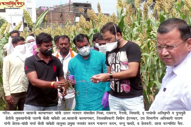 नैसर्गिक आपत्तीमुळे शेतकरी गेल्या पाच ते सहा वर्षांपासून हैराण झालेला आहे. यंदा वेळेवर पाऊस झाल्याने शेतकऱ्यांच्या आशा पल्लावल्या होत्या. मात्र, गत चार-पाच दिवसांपासून सुरु असलेल्या पावसामुळे शेतकऱ्यांच्या आशा मावळल्या असून, डोळ्यादेखत हातातोंडाशी आलेले पीक नेस्तनाबूत झाले आहे. दरम्यान शनिवारी (ता.१९) जिल्हाधिकारी डॉ. विपीन इटनकर यांनी आमदार बालाजी कल्याणकर यांच्यासह पूर परिस्थिती आणि शेतीच्या नुकसानीची पाहणी केली. नुकसानीचे तातडीने पंचनामे करण्याचे आदेश त्यांनी संबंधित अधिकाऱ्यांना दिले असून, पीक विमा भरलेल्या शेतकऱ्यांना तसेच शासनाच्या आदेशानुसार ३३ टक्याहुन जास्त नुकसान झालेल्या शेतीचे पंचनामे येत्या तीन दिवसात करण्यात येणार असल्याचे आश्वासन शेतकऱ्यांना दिले.