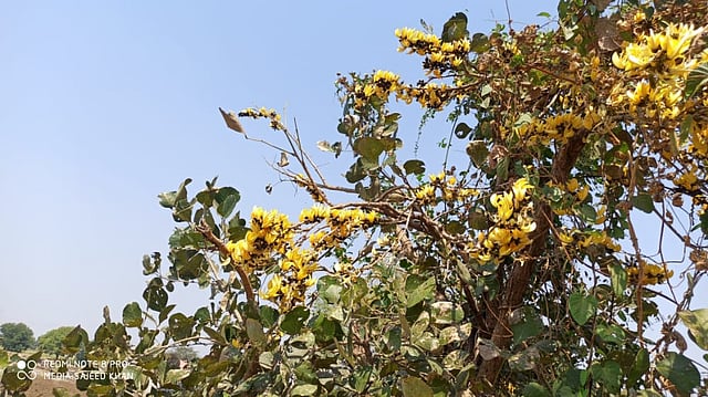 वाई बाजार (जिल्हा नांदेड) : रंगपंचमी जवळ आली की हमखास आठवण होते ती पळस फुलांची, भर उन्हात सगळी सृष्टी ओसाड पडू लागली असताना लाल- केशरी रंगाची भरगच्च फुले लागलेली पळसाची झाडे नजरेस पडताच निसर्ग सौंदर्याच्या घटनाक्रमाचा आकर्षण मनाला प्रसन्न करून जातं. लाल- केसरी पळस सगळ्यांच्याच परिचयाचा आहे. मात्र माहूर तालुक्यातील वाई बाजार परिसरातील माळरानात दुर्मीळ असा पिवळा पळस आढळून आल्याने प्रचंड कुतूहल निर्माण झाले असून पिवळा पळस फुललेल्याची ही दुर्मिळ घटना चर्चेचा विषय बनली आहे.