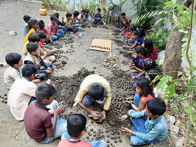 नांदेड : जिल्हा परिषद शाळा, शिराढोण तांडा (ता. कंधार) या शाळेतील (Z.P.School shiradhon) उपक्रमशील शिक्षक शिवाजी कपाळे यांच्या संकल्पनेतून व वर्ग पहिली ते चौथीच्या विद्यार्थ्यांच्या सहकार्यातून आगामी पावसाळ्यात देशी झाडे लावून ती जगवण्यासाठी तीन हजार 165 सीडबॉल तयार करण्यात आले आहेत. ह्या सीडबाॅलद्वारे (seedboll) समाजाच्या व आपल्या हितासाठी एक आगळी वेगळी नैसर्गिक चळवळ सुरु केली आहे. (Students- 'this'- school- in Nanded- district -produced 3,165- seedballs)