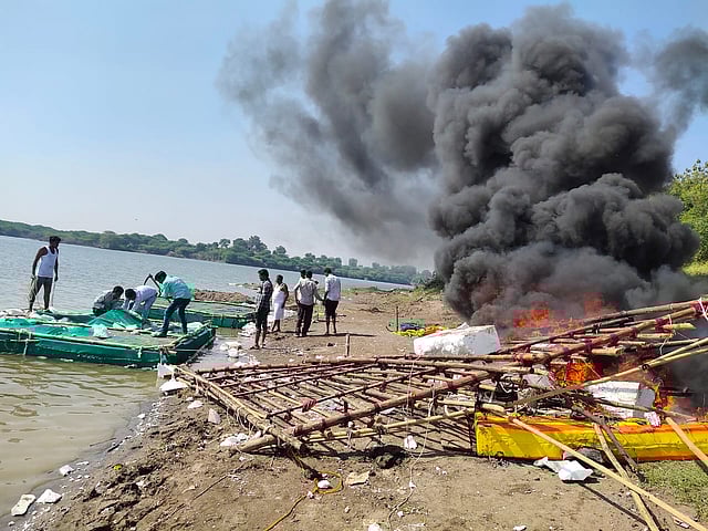 उमरी (जिल्हा नांदेड) : तालुक्यातील कौडगाव, महाटी, येंडाळा आदी घाटावरुन बेकायदेशीररित्या तराफ्याद्वारे अवैध वाळु उपसा करीत असल्याची माहिती तहसीलदार माधव बोथीकर यांना मिळताच त्यांनी कारवाई करत १४ तराफे जाळले.