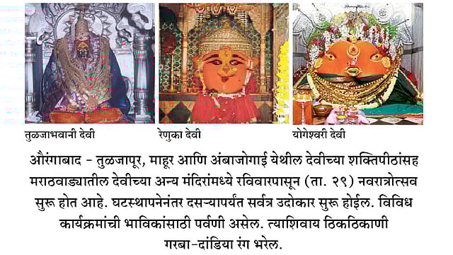 औरंगाबाद - तुळजापूर, माहूर आणि अंबाजोगाई येथील देवीच्या शक्तिपीठांसह मराठवाड्यातील देवीच्या अन्य मंदिरांमध्ये रविवारपासून (ता. २९) नवरात्रोत्सव सुरू होत आहे. घटस्थापनेनंतर दसऱ्यापर्यंत सर्वत्र उदोकार सुरू होईल. विविध कार्यक्रमांची भाविकांसाठी पर्वणी असेल. त्याशिवाय ठिकठिकाणी गरबा-दांडिया रंग भरेल.