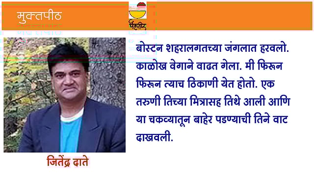 हार्वर्ड युनिव्हर्सिटीच्या कांही प्राध्यापकांशी संपर्क साधून एक भाषांतर आणि फोनेटिक टेक्नॉलॉजी घडवण्याच्या हेतूने मी बोस्टनला रवाना झालो. बोस्टन अतिशय प्रेक्षणीय आहे. तिथे ॲक्टन टाउन या निसर्गरम्य ठिकाणी आमचे स्नेही सुहास व नीलिमा कासार यांच्याकडे मुक्कामास होतो. पुण्यातील पर्वती टेकडी चढण्या- उतरण्याची गेले अनेक वर्षांची सवय होती. मला रोज किमान आठ-दहा किलोमीटर चालण्याचे अंगवळणी पडलेले. त्यातून इतका सुंदर परिसर असल्याने पदभ्रमंतीची संधी मी घेत होतो. त्यादिवशीही मी घराजवळच्याच रमणीय कालव्याभोवती फिरून त्याला लागूनच असलेल्या टाउन फॉरेस्टमध्ये, जंगलात चालण्याचे ठरविले. पाश्चात्य देशांमध्ये कालवा व नदीस ‘लेक’ म्हणतात. घरापासूनच अवघ्या एक किलोमीटर अंतरावर हे ठिकाण. निघायला थोडा उशीरच झाला होता. लेकपर्यंत पोचलो तेव्हा इतर मंडळी परतत होती. लेकच्याभोवती एक प्रदक्षिणा घालून मग जंगलात जाण्याचा निर्णय घेतला. लेकचे फोटो काढत, सेल्फी घेत अजून निम्मी प्रदक्षिणा पूर्ण झाली. संध्याकाळची वेळ होती. मी टाउन फॉरेस्टच्या दिशेनं चालायला लागलो. गगनचुंबी, सुंदर रंगीबेरंगी पानांनी नटलेली वृक्षवल्ली. हा पानझडीचा मौसम खूप प्रेक्षणीय असतो. मी जंगलात चालण्यासाठी खास बांधलेल्या ट्रेल रोडवरून चालत होतो. ट्रेल रोड सोडून जंगलात शिरलो. थोडेसे अंतर चालून गेल्यावर एक वयस्कर दांपत्य त्यांच्या कुत्र्याला फिरवत समोरून आले. त्यांना पाहून मला अजून चालण्याचा हुरूप आला. दुरूनच एक लांब शिंगांचे हरीण दिसले. सुसाट वेगाने नाहीसे झाले. पायाखालची पानझडीने भरलेली जमीन आता भूसभुशीत लागायला लागली होती. फार नाही, पण थोड्याशा उंच भागात मी येऊन पोचलो होतो. उंचावरून लेक आणि ॲक्टन टाउन साफ दिसत होते. उंचवट्याचे पठार आणि रंगलेले वृक्ष फार अंतरांवर नाहीत, हे लक्षात आल्यावर पठाराच्या माथ्यावर जाण्याचे ठरविले. तेव्हा बऱ्यापैकी उजेड होता. वर पोचल्यावर थोडी निराशा झाली. उंचवट्यापलीकडील खोऱ्यातली सुंदर फार्म हाऊसेस सोडल्यास काही नावीन्यपूर्ण पाहण्यासारखे नव्हते. मग परतीच्या मार्गाला लागलो. उंच झाडांमधून त्यांच्या बुंध्यांचा एक विशिष्ट वास येतो. बहुतेक पानझडीमुळे असेल. उतारावर लागल्यावर सगळे मार्ग एकसारखे वाटायला लागले. थोडे गोंधळल्यासारखे झाले.