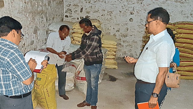 खतांच्या किमती गगनाला भिडत आहेत. वाढलेल्या किमतीमुळे जेथे ‘डीएपी’ खतांची पाच पोती आवश्यक असतात, तेथे एक किंवा दोनच पोती खरेदी केली जात आहे. अशातच पाडळी खुर्द येथे असणाऱ्या एका संघाकडून संस्थेला पुरवठा केलेल्या कमी किमतीचे खत ‘डीएपी’ खत म्हणून विक्री केली जात असल्याची तक्रार काही शेतकऱ्यांनी ‘सकाळ’कडे केली. कृषी अधीक्षक, कृषी अधिकारी कार्यालयात सायंकाळी ६.१५ वाजता शेतकऱ्यांनी आणलेल्या खतांची प्राथमिक तपासणी केली. यात ‘डीएपी’ म्हणून विक्री झालेले खत ‘डीएपी’ नसल्याचा संशय आला. तक्रारदार शेतकऱ्यांनी संबंधित संस्थेची आणि खतविक्री करणाऱ्या संघाची तपासणी करावी, अशी विनंती केली. यावर, प्रकरण गंभीर आहे, उद्या नाही तर आज आणि आताच छापा टाकू, असे म्हणत जिल्हा अधीक्षक कृषी अधिकारी श्री. वाकुरे यांनी तत्परता दाखवून जिल्हा परिषदेचेचे कृषी अधिकारी चंद्रकांत सूर्यवंशी, कृषी उपसंचालक भाग्यश्री पवार-फरांदे, जिल्हा गुणनियंत्रण निरीक्षक आर. एस. शेळके आणि त्यांची टीम घेऊन पाडळी खुर्द (ता. करवीर) गाठले. याच गावात असणाऱ्या एका संस्थेत सायंकाळी ७.३० च्या दरम्यान वाकुरे यांनी टीमसह छापा टाकला.