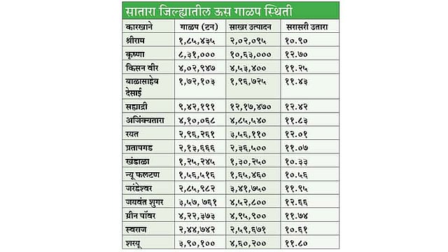 जिल्ह्यातील नऊ सहकारी व सहा खासगी कारखान्यांनी ऊस गाळप झाले. जिल्ह्यात उसाच्या क्षेत्रात घट झाल्याने हा हंगाम मार्चच्या सुरवातीस संपला आहे. सह्याद्री कारखान्याने सर्वाधिक नऊ लाख ४२ हजार १९१ मेट्रिक टन इतके गाळप केले असून, १२ लाख १७ हजार ४७० क्विंटल साखर निर्मिती केली. साखर उताऱ्यात कृष्णा कारखान्याची आघाडी असून, या कारखान्याचा सरासरी उतारा १२.७० टक्के आला आहे. जयवंत शुगर या खासगी कारखान्याने सर्वाधिक दर दिला. या कारखान्याने प्रती टनास दोन हजार ८५० रुपये दिला आहे. जिल्ह्यात खासगी कारखान्यांच्या संख्येत वाढ झाल्याने या कारखान्यांकडून गाळपाचे प्रमाण वाढले आहे. सहा खासगी कारखान्यांनी १८ लाख ५७ हजार ३८४ मेट्रिक टन उसाचे गाळप करत २१ लाख ७५ हजार ७८१ क्विंटल साखरेची निर्मिती केली आहे, तसेच नऊ सहकारी कारखान्यांनी ३५ लाख ७८ हजार ९१८ मेट्रिक टन उसाचे गाळप करून ४३ लाख ४१ हजार ९० क्विंटल साखरेची निर्मिती केली आहे.