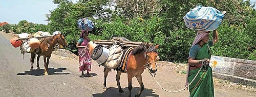 लता व मीरा ह्या वाळवा तालुक्यातील शिरगावहून संसारपयोगी साहित्य घोड्यावर लादून गावकडं चालत निघाल्यात.