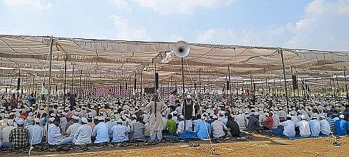 कर्जत : तब्लिग इज्तेमाच्या शेवटच्या दिवशी भाविकांनी अलोट गर्दी केली होती. एखाद्या धार्मिक कार्यक्रमासाठी झालेली ही आजपर्यंतची उच्चांकी गर्दी होती. रात्री मगरीब नमाज पठणानंतर विश्वशांतीसाठी दुवा मागण्यात आली. आमदार रोहित पवार यांच्यासह विविध राजकीय पक्षाच्या पदाधिकाऱ्यांनी कार्यक्रमास भेट दिली.