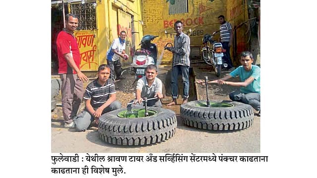 कोल्हापूर - ‘हे पंक्चर काढायचे दुकान आहे का, खुळ्याची चावडी’, असे काही लोक मुद्दाम चेष्टेने म्हणायचे... पंक्चर काढणाऱ्यांच्या हालचाली चेहऱ्यावरचे भाव पाहून कुत्सितपणे हसायचे. पण हे आठ जण मात्र समोरच्याकडे लक्ष न देता, शांतपणे काम करत राहायचे. एकजण पंक्चर झालेले चाक काढायचा. दुसरा पंक्चर शोधायचा. तिसरा पंक्चर काढायचा. चौथा हवा भरायचा. सुरुवातीला ते थोडे गोंधळायचे. हळूहळू त्यांचा जम बसला आणि आज पंक्चर काढायचे हे दुकान एकदम फास्ट आहे. विशेष हे की, येथे काम करणारे हे आठही जण मतिमंद, गतिमंद, मूकबधिर आहेत. पण शहाण्या धडधाकट माणसाला लाजवतील असा त्यांचा या कामात हात बसला आहे.