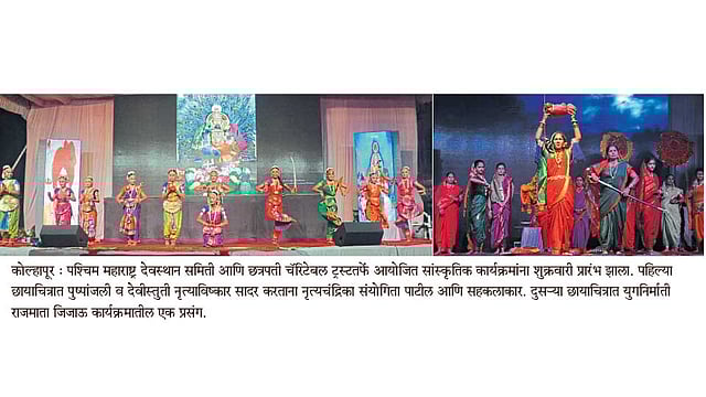 भरतनाट्यम् नृत्यचंद्रिका संयोगिता पाटील आणि त्यांच्या सहकाऱ्यांनी ‘पुष्पांजली’ व त्यानंतर देवीस्तुती नृत्याविष्कार सादर केला. त्यानंतर युवराज्ञी संयोगिताराजे छत्रपती यांच्या हस्ते शस्त्रपूजन झाले. स्थानिक ७० हून अधिक महिलांच्या युगनिर्माती राजमाता जिजाऊ कार्यक्रमातून राष्ट्रप्रेमाची चेतना जागवली गेली; तर शंभूराजे मर्दानी खेळ विकास संस्थेच्या मावळ्यांनी चित्तथरारक शिवकालीन युद्धकलेची प्रात्यक्षिके सादर केली. सचिन दाभाडे यांच्या हलगीवादनाने या कार्यक्रमाची उंची वाढली.