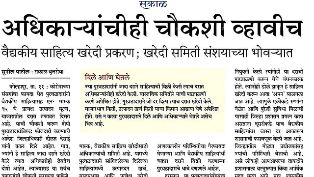 कोरोनासाठी घेतलेल्या वैद्यकीय साहित्यांमधील दर तफावतीमध्ये दोषी असणाऱ्या पुरवठादारासह यामध्ये सामिल अधिकारी आणि चौकशी समितीचीही चौकशी व्हावी यासाठी शनिवारी (ता. 12) "दैनिक सकाळ'मधून अधिकाऱ्यांचीही चौकशी व्हावीच अशा आशयाची वृत्त प्रसिध्द केले होते.
