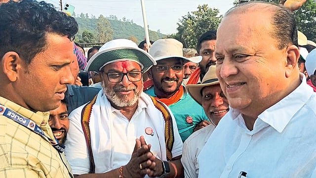 सेनापती कापशी : पालकमंत्री हसन मुश्रीफ (Hasan Mushrif) आणि आक्रोश पदयात्रेतील स्वाभिमानी शेतकरी संघटनेचे नेते माजी खासदार राजू शेट्टी (Raju Shetti) यांची कापशी ते मुरगूड मार्गावर हळदवडे (ता. कागल) येथे भेट झाली.