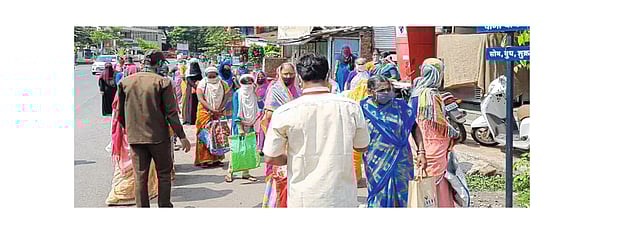लॉकडाउनमुळे हातावर पोट असलेल्यांची रोजंदारी बुडाली आहे. त्यांना आता रेशनच्या धान्याचाच आधार आहे. दोन दिवसांपासून प्रती व्यक्ती पाच किलो मोफत तांदूळ वाटपाची कार्यवाही सुरू आहे. धान्य संपेल या भीतीने लाभार्थी दुकानांसमोर गर्दी करीत आहेत. आज तालुका संघाच्या रेशन दुकानासमोर दोनशे ते अडीचशे लाभार्थी गोळा झाले होते. उपस्थित सर्व लाभार्थींचे कार्ड गोळा करून धान्य वाटप करण्याचे नियोजन होते. कार्ड देऊन लोक रांग सोडून एकत्र येऊ लागले. दुकानासमोर मारलेल्या चौकोनाचाही काहीच उपयोग झाला नाही