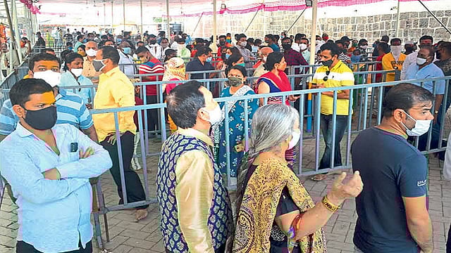 आठ महिन्यांनंतर भाविकांना प्रत्यक्ष देवीचे दर्शन घडू लागले आहे. त्यामुळे लवकरात लवकर देश कोरोनामुक्त होऊ दे, असे साकडे त्यांच्याकडून घातले जात असून मास्क न घालणाऱ्या भाविकांवर दंडात्मक कारवाई होणार आहे.