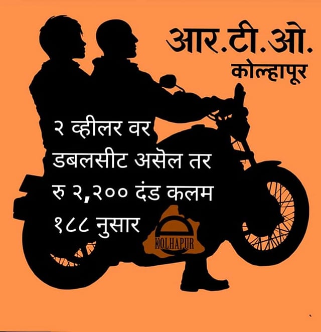 कोल्हापूर - दुचाकीवरून डबलसीट निघाला तर 2200 रुपये दंड केला जाईल. कलम 188 नुसार ही कारवाई करण्यात येणार असल्याचे एक पोस्टर सोशल मीडियावर व्हायरल झाले आहे. कोल्हापूर आरटीओ कार्यालयाकडून ही माहिती प्रसिद्ध केल्याचे संदर्भ या पोस्टवर आहेत, प्रत्यक्षात हे पोस्टर "फेक" आहे, प्रादेशिक परिवहन कार्यालय (आरटीओ) यांनी असे कोणतेही पोस्टर प्रसिद्धीस दिलेले नाही किंबहुना त्याबाबतचे आदेश काढलेले नाहीत.