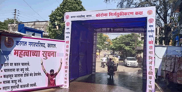 जिल्ह्यात आणि राज्यात आरोग्य सेवेत नेहमीच अग्रेसर राहिलेल्या, कागल पालिकेच्या आरोग्य विभागातील कर्मचाऱ्यांनी पालिकेच्या समोर कोल्हापूर वेशीत हा निर्जंतुकीकरण कक्ष उभा केला आहे. नगरपरिषदेच्या बागांमधील झाडांना पाणी देण्यासाठी वापरल्या जाणाऱ्या स्प्रिंकलरच्या वापराविना पडून असलेल्या टाकाऊ पाईप, मोटर आणि पाण्याच्या टाकीचा वापर यासाठी करण्यात आला आहे. वीस स्प्रिंकलर कारंजांचा वापर त्यासाठी करण्यात आला आहे. तीन हजार लिटर पाण्याच्या टाकीला हे मोटर बसवून त्यास कारंजाची पाईप जोडण्यात आली आहे. पाण्याच्या टाकीत सोडियम हायपोक्लोराईडचे द्रावण टाकण्यात आले आहे. या कक्षातून शहरात प्रवेश करणाऱ्या आणि शहरातून बाहेर जाणाऱ्या प्रत्येक व्यक्ती आणि वाहनावर हे द्रावण फवारण्यात येत आहे. १४ एप्रिल पर्यंत रोज सकाळी ९ ते रात्री १० पर्यंत हा कक्ष सुरू राहणार आहे. त्यासाठी कर्मचाऱ्यांची नियुक्तीही करण्यात आली आहे.