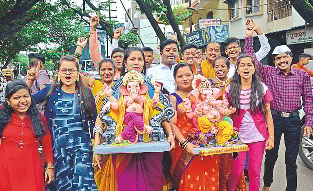 पारंपारिक वेशभुषेच्या पेहरावात गणेशोत्सव चांगलाच मंगलमय बनून गेला. गल्लोगल्ली हालगी, ताशा, ढोल वाद्यांचा ताल धरत प्रचंड जयघोषात बाप्पाचे आगमन केले जात होते. कुणी ढकलगाडीतून, कुणी बाईकवरून तर अनेकांनी सहकुटुंब बाप्पाचे आगमन घरी केले. विविध रूपातील गणेश मुर्तीबरोबर जशाचतशा वेशभुषेत तरूणाई दिसली.