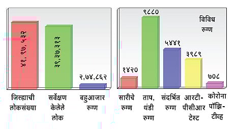 राज्यात कोरोना बाधितांची संख्या कमी होत असली तरी भविष्यात कोरोनाची लाट येण्याची शक्यताही नाकारली जात नाही. त्यामुळे पुढील काळात येणाऱ्या संकटाचा सामना करण्यासाठी राज्य शासनाने 15 सप्टेंबर ते 10 ऑक्टोबरपर्यंत माझे कुटुंब, माझी जबाबदारी ही मोहीम राबवण्यास सुरुवात केली आहे. जिल्ह्यात मोठ्या ताकतीने ही मोहीम राबवली जात असून आत्तापर्यंत 94 टक्के लोकसंख्येचे सर्वेक्षण केले आहे. जिल्ह्याची लोकसंख्या सुमारे 42 लाख इतकी असून 9 लाख 40 हजार इतकी घरांची संख्या आहे. यातील 9 लाख 25 हजार घरांचे व 39 लाख 37 हजार लोकांचे सर्वेक्षण पूर्ण करण्यात आले आहे. सर्वेक्षण करण्यासाठी 1836 पथकांच्या माध्यमातून 5508 लोक काम करत आहेत.