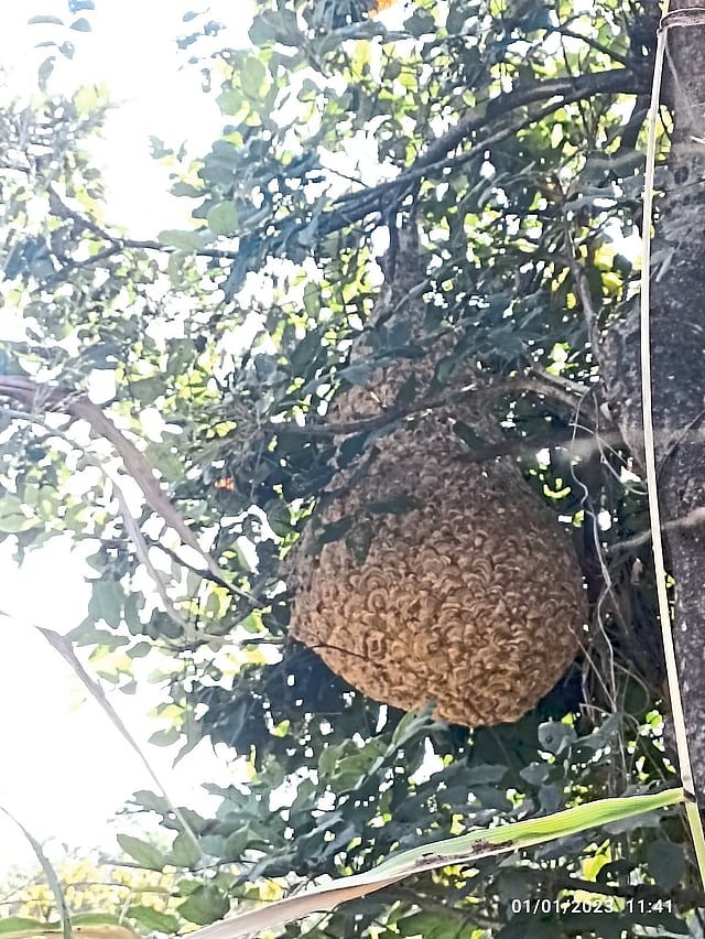 बोरपाडळे, ता. १ : नावली पैकी कोतमीरवाडी (ता. पन्हाळा) येथील विशाल जांभळे शेतकऱ्याला जांभळेवाडी भागातील शेतात गांजिन्याचे घरटे आढळले. एका झाडाला मोठे बांधलेले हे घरचे सुमारे तीन फूट उंच आणि दोन फूट रुंदीचे आहे.