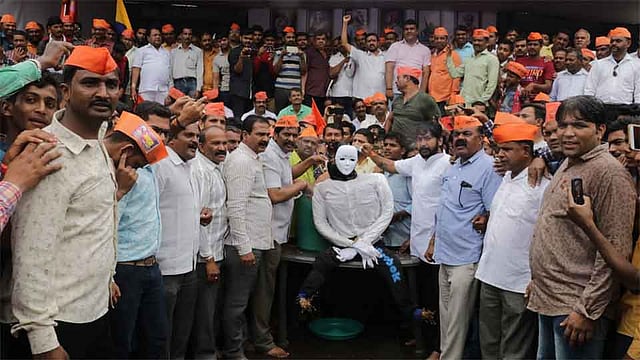 कोल्हापूर - मराठा आरक्षणाकडे दुर्लक्ष करणाऱ्या भ्रष्ट सरकारच्या विरोधात शंखध्वनी करत सरकारच्या प्रतिकात्मक पुतळ्याला नाल्यातील पाण्याचा अभिषेक करण्यात आला. आंदोलनकांनी यावेळी सरकारच्या विरोधात घोषणाबाजी केली. गेल्या काही दिवसांपासून दसरा चाैक येथे मराठा आरक्षणासाठी आंदोलन सुरू आहे.