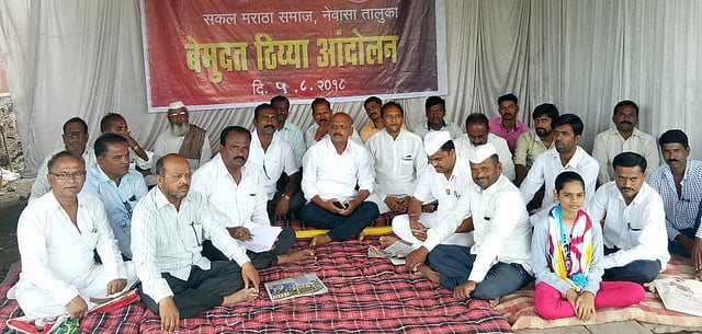 'एक मराठा... लाख मराठा..' 'यळकोट.. यळकोट.. जय मल्हार' व 'आरक्षण दो.. आरक्षण दो..' 'हम सबको आरक्षण दो..' या घोषणा देत सकल मराठा समाजाचे अनिल ताके, भाऊसाहेब वाघ, मेजर संभाजी माळवदे, दीपक धनगे, धनगर समाजाचे नेते अशोक कोळेकर व मुस्लीम नेते युसुफ बागवान यांनी आरक्षणाच्या मुद्द्यावर आज नेवासे शहरातील खोलेश्वर चौकात मंडप देवून बेमुदत ठिय्या आंदोलनास प्रारंभ केला. नेवाशाचे तहसीलदार उमेश पाटील व सहाय्यक पोलिस निरीक्षक डॉ. शरद गोर्डे यांना या बाबत आंदोलकांच्या वतीने शनिवारी निवेदन देण्यात आले होते.