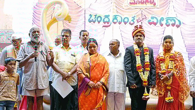 हुक्केरीतील चंद्रकांत गवाणे आणि संकेश्वर येथील विणा मननाईक असे या वर-वधूचे नाव आहे. चंद्रकांत हा पूर्वीपासून अनाथ मुलांसाठी कार्य करतो. त्यामुळेच त्याने आपला विवाह अनाथ मुलांसमवेत साजरा करण्याची इच्छा व्यक्त केली. त्याला वधू विणानेही सहमती दर्शविली. त्यानुसार शुक्रवारी महेश फौंडेशनच्या सभागृहात हा विवाह सोहळा झाला. राष्ट्रकवी कुवेम्पू यांच्या "मंत्र मांगल्य' या संकल्पनेचा आदर्श घेऊन हा विवाह करण्यात आला. अतिखर्चात व प्रतिष्ठेतील विवाह टाळून सोप्या व साध्या पद्धतीने विवाह करणे हीच "मंत्र मांगल्य' यामागची संकल्पना आहे. मनुष्याच्या जीवनातील प्रत्येक क्षण अमूल्य असून त्याचे प्रदर्शन करू नका, अशी शिकवणही ही संकल्पना देते. त्याचेच अनुकरण करत चंद्रकांत व विणा यांनी अंत्यत साधेपणाने विवाह करुन एकमेकांना आयुष्यभराची साथ देण्याचे वचन दिले.
