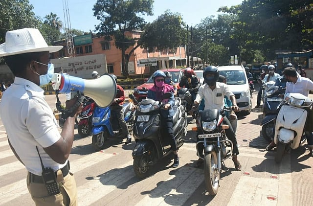 बेळगाव : वाहतूक नियम आणि कोरोनाबाबत (Covid -19) वाहतूक पोलिसांकडून आता जागृती केली जात आहे. शहरातील सिग्नलवर (Signals) थांबून लाऊडस्पीकरद्वारे पोलिस नागरिकांना सूचना करत आहेत. जिल्ह्यात (Belgaum district) दिवसेंदिवस कोरोना बधितांची संख्या झपाट्याने वाढत आहे. त्यामुळे जिल्हा प्रशासन सतर्क झाले आहे. कोरोनावर नियंत्रण मिळवण्यासाठी प्रयत्न केले जात आहेत. दररोज रात्री १० नंतर नाईट कर्फ्यु (Night Curfew) आणि शनिवार-रविवार दोन दिवस विकेंड कर्फ्यु (Weekend Curfew) लागू करण्यात आला आहे.