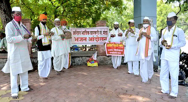 दक्षिण सोलापूर : कोजागरी (अश्विन) ते त्रिपुरारी (कार्तिकी) पौर्णिमेपर्यंत प्रत्येक मंदिरात काकडारती करण्याची वारकरी परंपरा आहे. ती जपण्यासाठी मंदिरे उघडून काकड्यासह भजन कीर्तनास परवानगी देण्याच्या मागणीसाठी अखिल भाविक वारकरी संप्रदायिक मंडळाच्या वतीने आज (ता.29) जिल्हाधिकारी कार्यालयासमोर भजन अंदोलन करण्यात आले.