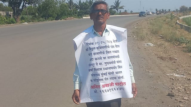 मोहोळ : सन 2019 मध्ये चालविलेल्या चारा छावणीचे बिल शासनाने अद्यापही आदान न केल्याने शिरापूर ता मोहोळ येथील छावणी चालक अनिल आबाजी पाटील हे मुंबई येथे मुख्यमंत्र्यांना भेटण्यासाठी व न्याय मागण्यासाठी एक मे या महाराष्ट्र दिना पासुन पायी निघाले आहेत.