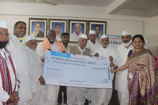 नातेपुते (सोलापूर) : त्र्यंबकेश्वर येथील श्री संत निवृत्तीनाथ महाराज समाधी मंदिर जीर्णोद्धारासाठी युवकमित्र ह. भ. प. बंडातात्या कराडकर यांनी 11 लाख 11 हजार 111 रुपये प्रज्ञाचक्षू त्र्यंबकबाबा भगत यांच्या हस्ते विश्वस्तांकडे दिले.