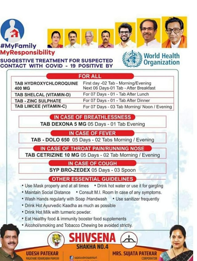 या मोहिमेच्या संदर्भात शिवसेनेच्या वतीने एक पोस्टर काढण्यात आले आहे. त्यामध्ये नागरिकांनी त्यांच्यामध्ये असलेल्या कोरोना रोगाच्या लक्षणानुसार कोणती औषधी ध्यावीत याची माहीती दिली आहे.
