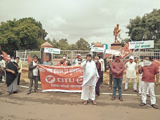 सेंटर ऑफ इंडियन ट्रेड युनियन्स (सिटू) च्या वतीने रेल्वेच्या खासगीकरणाविरोधात सार्वत्रिक देशव्यापी संपाची हाक देण्यात आली. त्याअनुषंगाने सोलापूर येथे ज्येष्ठ कामगार नेते श्री. आडम यांच्या मार्गदर्शनाखाली व सिटूचे राज्य महासचिव ऍड. एम. एच. शेख यांच्या नेतृत्वाखाली महात्मा गांधी पुतळा येथे गुरुवारी सकाळी 11 वाजता निदर्शने करण्यात आली. रेल्वे खासगीकरण रद्द करा, क व ड वर्गातील 50 टक्के पदे रिक्त करण्याचा निर्णय मागे घ्या, एक लाख 25 हजार रिक्त पदे तातडीने भरा अशा घोषणा देण्यात आल्या.